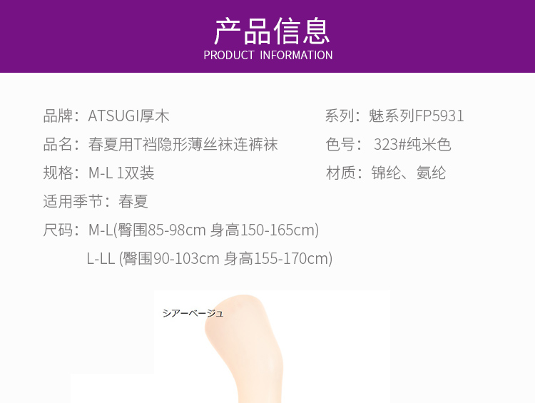一般贸易 日本厚木ASTIGU魅系列FP5931春夏用T裆隐形薄丝袜连裤袜 323#纯米色M-L 1双装