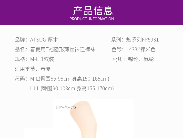 一般贸易 日本厚木ASTIGU魅系列FP5931春夏用T裆隐形薄丝袜连裤袜 323#纯米色M-L 1双装