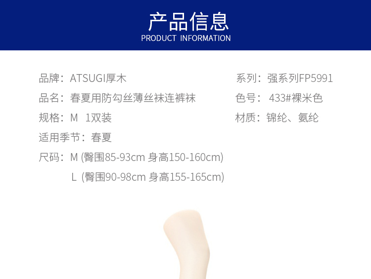 宁波保税直发 日本厚木ASTIGU强系列FP5991春夏用防勾丝薄丝袜连裤袜 433#裸米色M 1双装