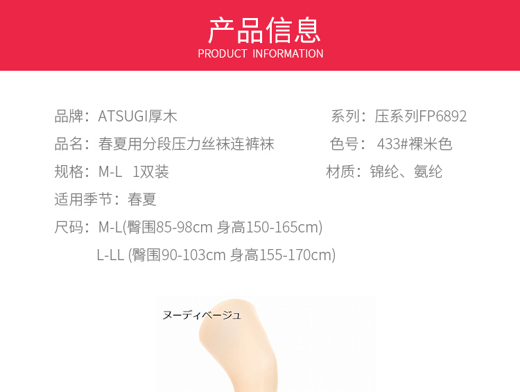 宁波保税直发 日本厚木ASTIGU压系列FP6892春夏用分段压力丝袜连裤袜 433#裸米色M-L 1双装