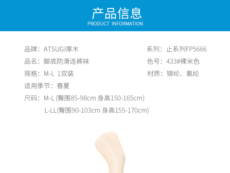 宁波保税直发 日本厚木ASTIGU止系列FP5666脚底防滑连裤袜 433#裸米色M-L 1双装【2双装组合】