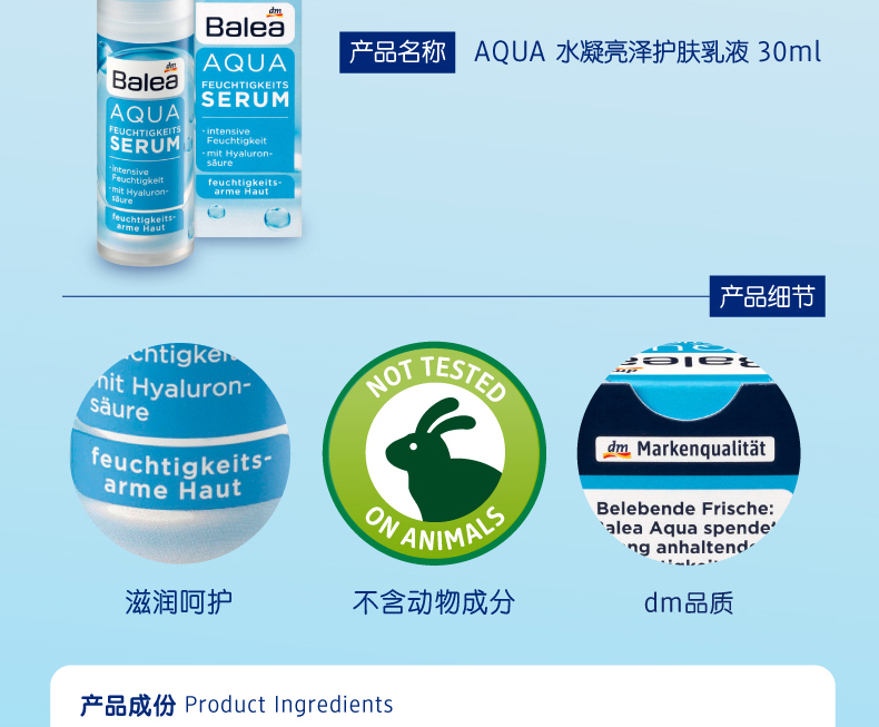 香港直邮 德国Balea芭乐雅玻尿酸蓝藻水凝精华乳液 30ml